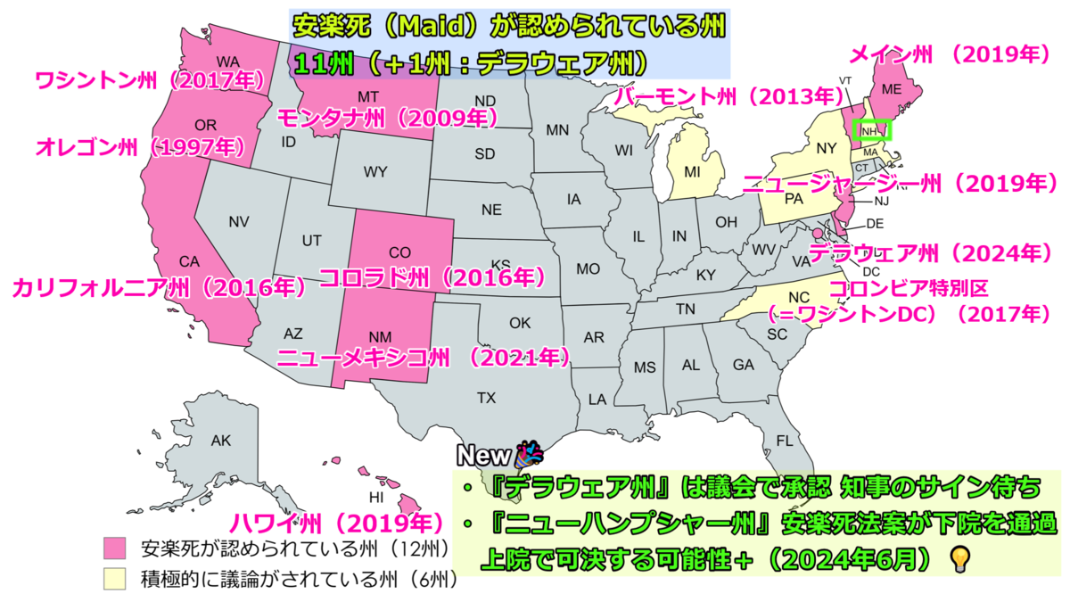 2024年8月時点でのアメリカで『安楽死が認められている州』です。